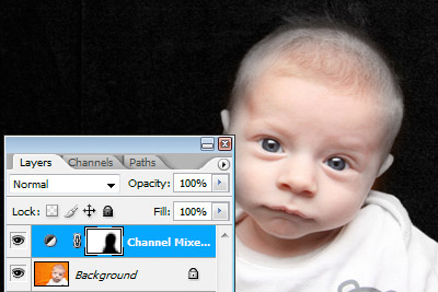 So, I painted with black on the Channel Mixer layer mask to reveal the coloured skin again. That way, the background and the edges of the child were black-and-white, but not the bulk of the skin: